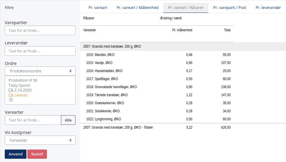Du kan selvfølgelig også dykke længere ned i kostprisberegningen ved at se på alle de omkostninger, som færdigvarens kostpris består af dvs. fordelt på produktionsomkostninger, fragt, varekøb, analyseomkostninger osv. Læs mere om rapporten her.