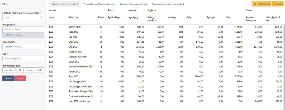 Den nye rapport for lagerbevægelser giver fuldt overblik over hvilke bevægelser varepartier har indgået i med hensyn til ordrer og justeringer. Af rapporten fremgår både oplysninger om sporbarhed såvel som lagerbeholdning for en given periode.