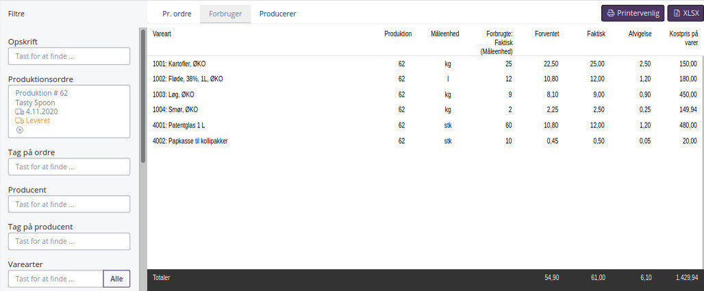 Nu kan du se kostpriser i rapporten Produktion & Udbytte. Det gør det nemmere at identificere hvilke råvarer der bidrager med den største omkostning i produktionen, når det sammenholdes produktionsspild og udbyttet.