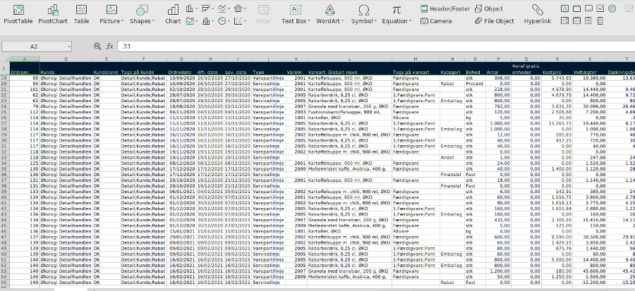 Vi har sørget for at opdele dine data op i såkaldt tabuleret form, så hver type af information står i hver sin række. Så er oplysningerne kompatible med at lave en pivottabel. Samtidig har vi samlet alle tænkelige oplysninger i udtrækket, så du kan lave dén rapport, som passer til dit formål.