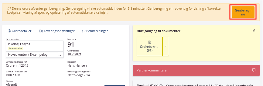 For at optimere hastigheden af indtastningen af nye oplysninger eller tilføjelse af nye ordrelinjer, beregner tracezilla nøgletal m.m. på ny for en ordre nogle få minutter efter ændringen.