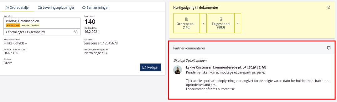Når en kommentar er tilknyttet kunden, leverandøren eller producenten, vil partnerkommentaren blinke langsomt rød seks gange på ordren. Derefter vil sektionen være markeret med rød. Partnerkommentaren vises som en sektion på alle ordrer.