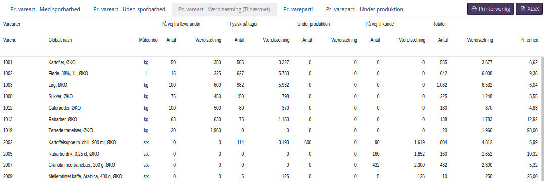 Rapporten giver mulighed for at se tilførsel og afgang af varepartier samt hvilken værdi det enkelte vareparti repræsenterede på lageret.