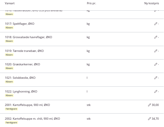 Mulighed for at justere kostprisen for varer