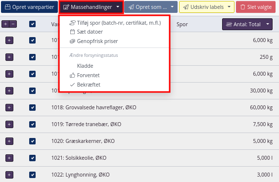 Funktionen Massehandlinger kan også bruges til at tilføje et spor til alle varepartier på en ordre fx et ejerspor eller en certifikatreference.
