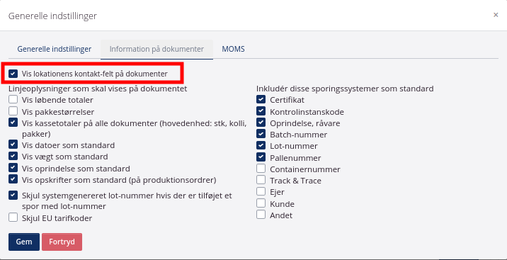 Kontaktoplysninger kommer med på dokumenter, såfremt det er valgt til i virksomhedsindstillingerne.