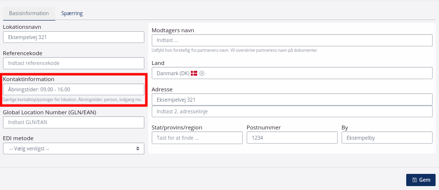 Oplysningen angives på en lokation, da denne type kontaktoplysning oftest er knyttet til en specifik leveringsadresse. Læs mere om lokationer og tilhørende oplysninger her.