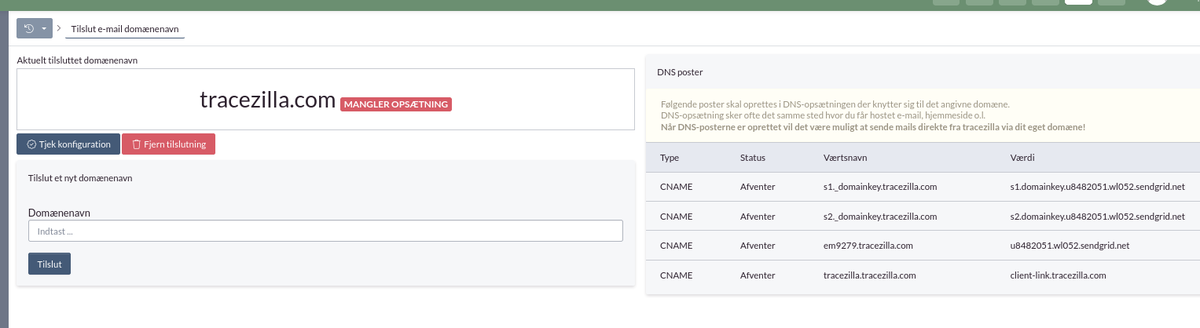 Vil du gerne kunne sende mails fra tracezilla fra din egen mailadresse som afsender? Så kan du tilknytte dit e-maildomænenavn til din tracezilla-konto.