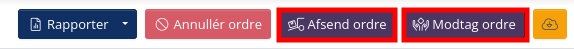 Når du har modtaget eller afsendt en ordre kan du nemt markere varepartierne som modtaget/afsendt ved hjælp af hurtigknapperne Afsend ordre og Modtag ordre i øverste højre hjørne på ordren.