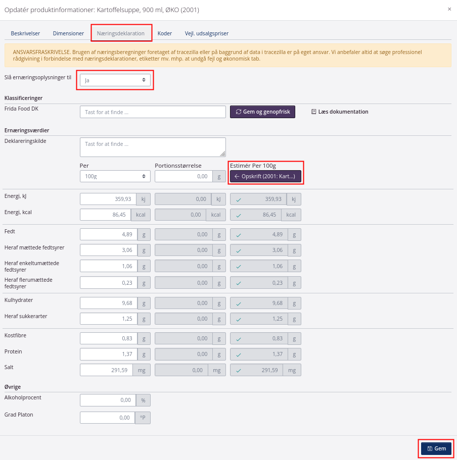 Information om næringsindhold skal oprettes på den enkelte råvare, og du har selv ansvar for at sikre, at der anvendes korrekte data i overensstemmelse med Fødevarestyrelsens foreskrifter.