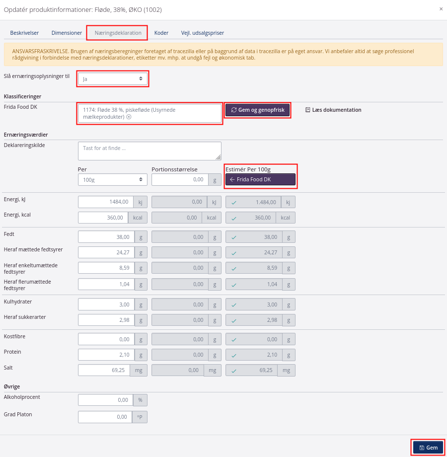 Start med at slå ernæringsoplysninger til. Søg herefter den relevante råvare frem i feltet under Klassificeringer. Tryk Gem og genopfrisk, når den korrekte vare er valgt, og derefter Estimér Per 100g - Frida Food DK, så importeres data på varen fra Frida Food til tracezilla.