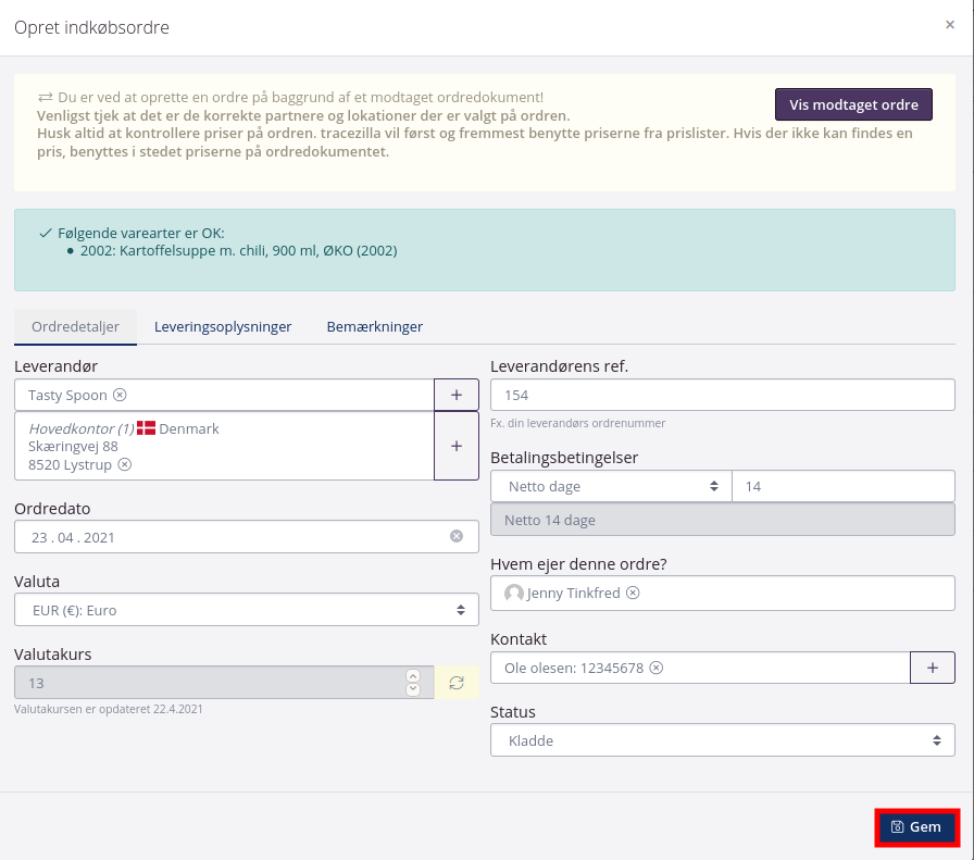 - Der kommer nu et dialogvindue frem, hvor oplysningerne i ordrehovedet matches med de oplysninger som fremgår af dokumentet. Når der klikkes Gem, vil ordren ligge i ordreoversigten.