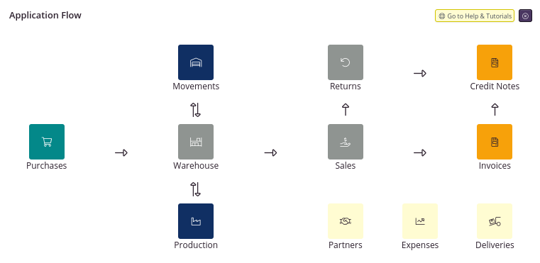 Partners, expenses anddeliveries go across the flow and are used in all parts of the flow chart.You can click on the individual icon in the application flow to go directly to the function, e.g. you can click on Sales to go to the overview of your sales orders.