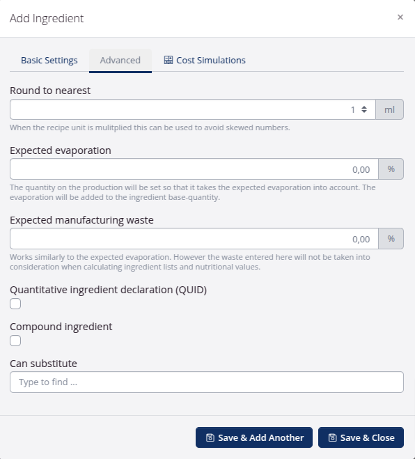 - Enter the quantity of the ingredient for one recipe unit. if you tick the box by Calculate as percentage of produced net weight you can enter the ingredient as a percentage of the end product.