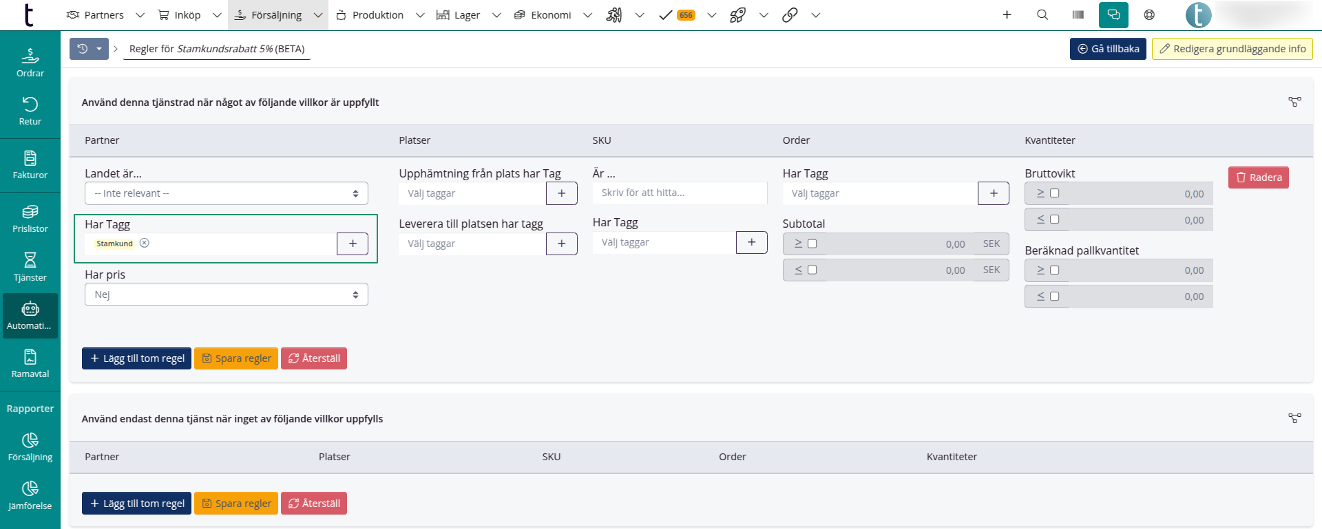 Den automatiska orderraden kan kopplas till en order, en partner eller en artikel med hjälp av taggar. Läs mer om taggar här. Det kan vara smart att använda taggar för automatisering av pant och frakt, eftersom det ger möjlighet att koppla den automatiska orderraden till flera partners eller artiklar.