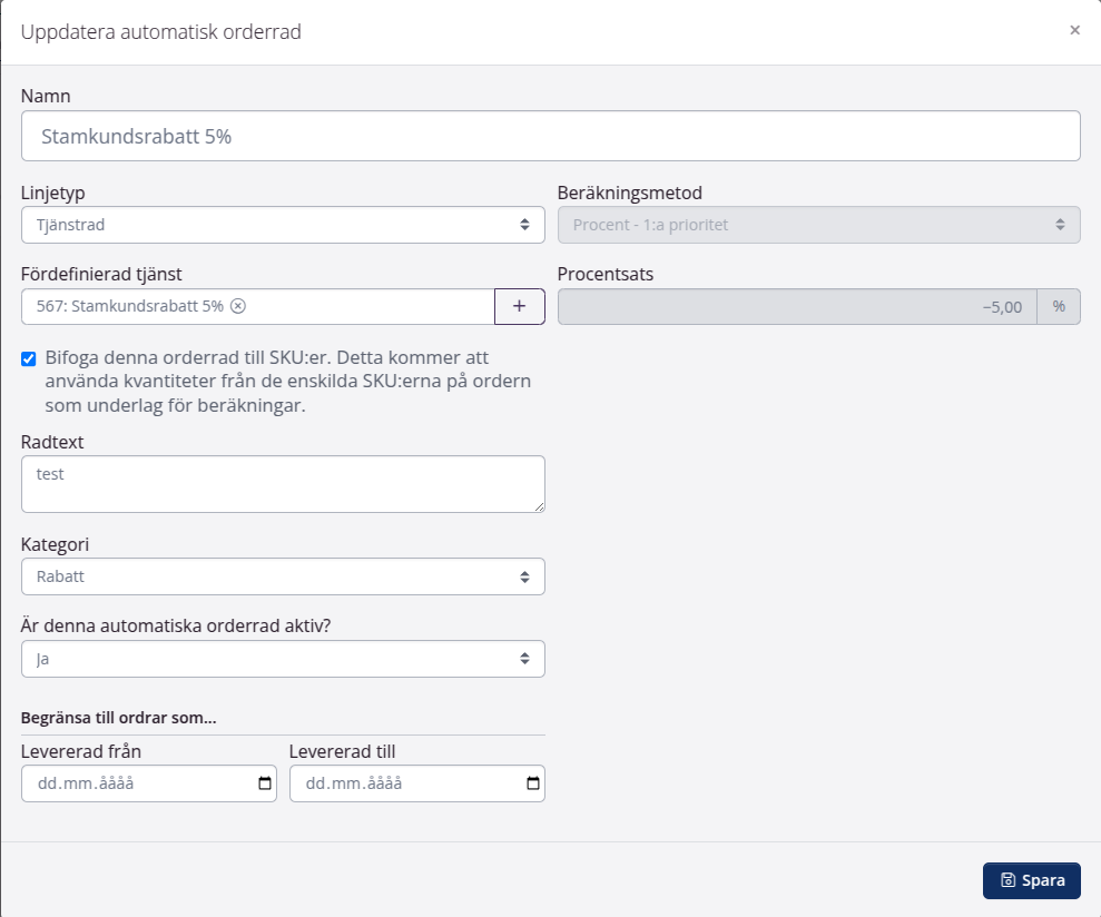 Genom att markera Bifoga denna orderrad till SKU:er kommer den automatiska orderraden att kopplas till varje enskild artikel på en order där artiklen har en tagg eller artiklen är en specifik artikel. Detta kan till exempel användas om du ska fakturera pant för specifika produkter och inte för andra.