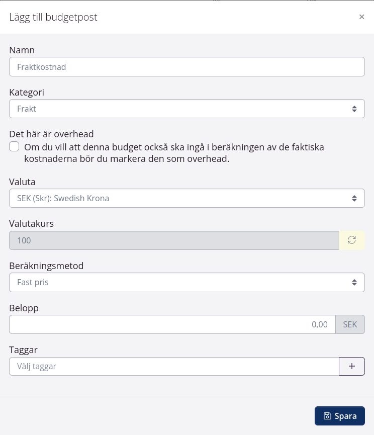 Det är möjligt att själv lägga till budgetposter för till exempel förväntade fraktkostnader, lönearbete, förpackning, tull osv.