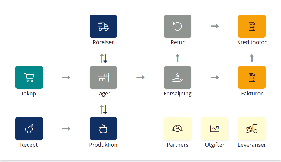- När dina varor finns i lager kan du använda dem för produktion. För att bearbeta eller packa varor från ditt lager skapar du en Produktionsorder.