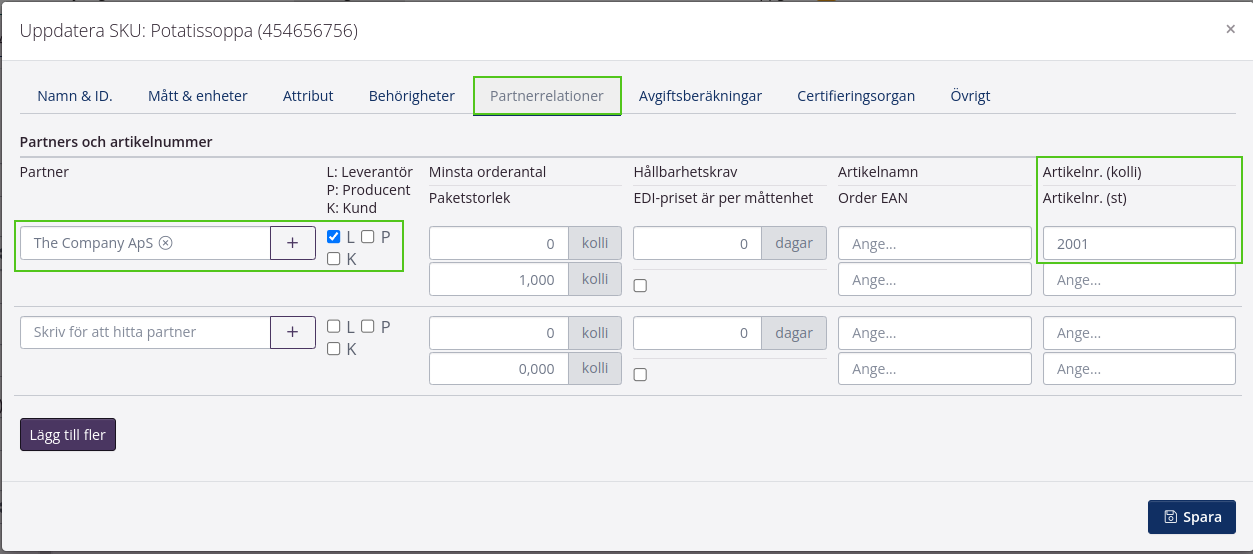 En partnerrelation måste läggas till under Lager > Artiklar för att matcha dina artiklar med din partners artiklar. Genom att göra det vet tracezilla vilken SKU i kundens system som är identisk med vilken SKU i leverantörssystemet och vice versa. Du kan läsa mer om Partnerrelationer här.