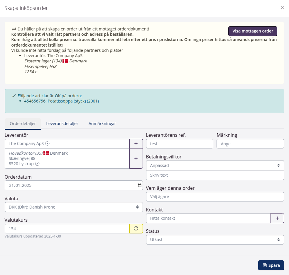 - Kontrollera att tracezilla har valt rätt partner och platser på beställaren. Kom ihåg att kolla priserna också. tracezilla kommer att leta efter ett pris i prislistorna. Hittas inga priser så kommer priserna från orderdokumentet att användas istället! Var uppmärksam på enheterna, t.ex. om artikeln har satts upp som kolli av den ena parten och som st av den andra.